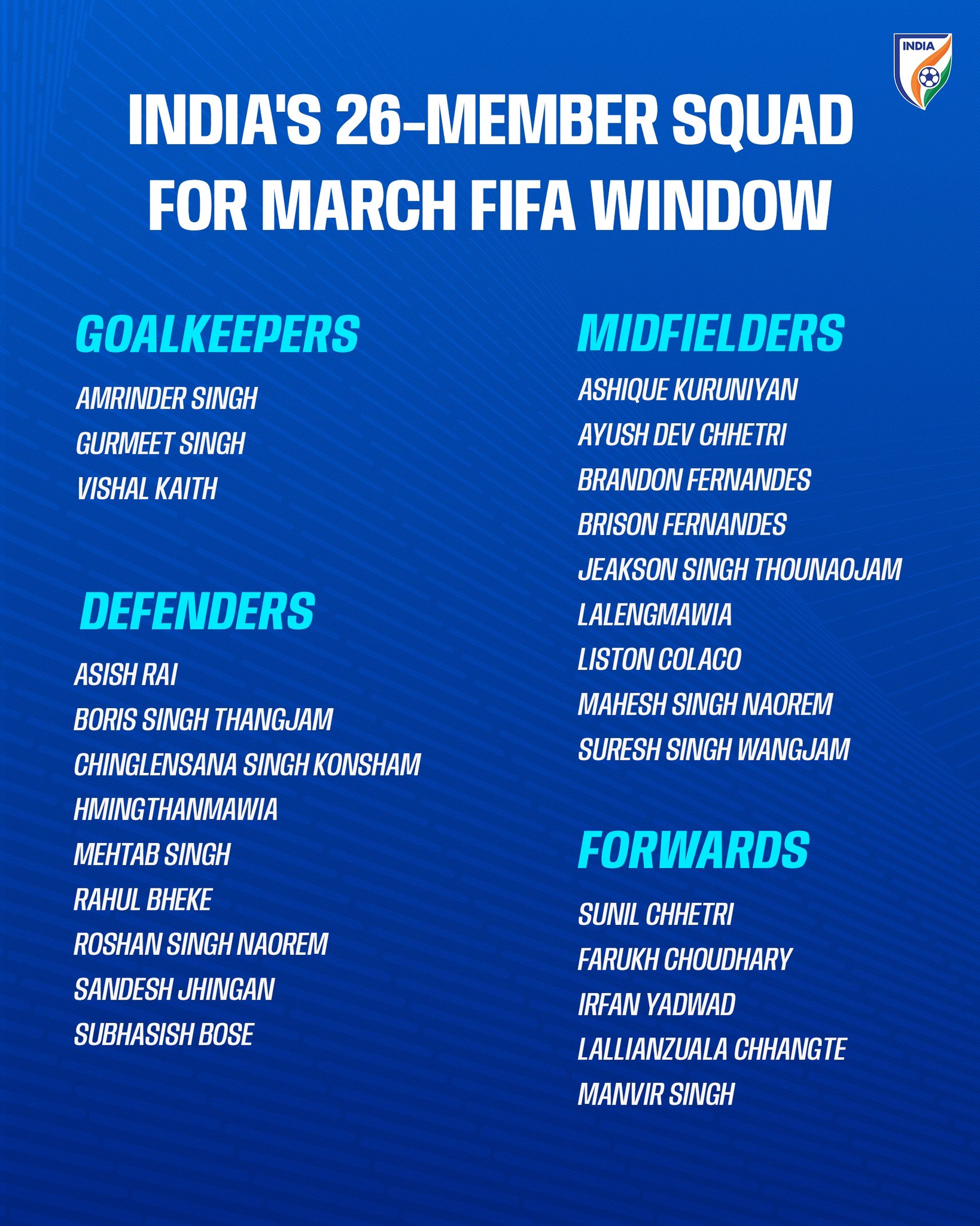 印度將在3月19日友誼賽對陣馬爾代夫,3月25日亞足聯亞洲杯預選賽對陣孟加拉國。