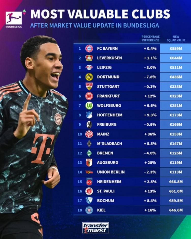 3月28日訊 德轉在當地時間3月27日更新了德甲球員身價,并列出了德甲各隊身價排名,拜仁8.59億歐居首,勒沃庫森、萊比錫、多特、斯圖加特2-5位。