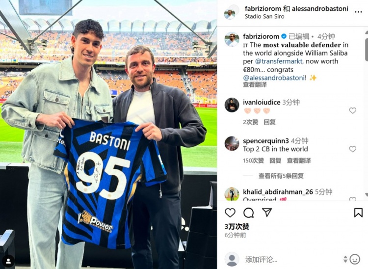 羅馬諾社媒曬與巴斯托尼合影:8000萬歐,世界身價并列最高后衛